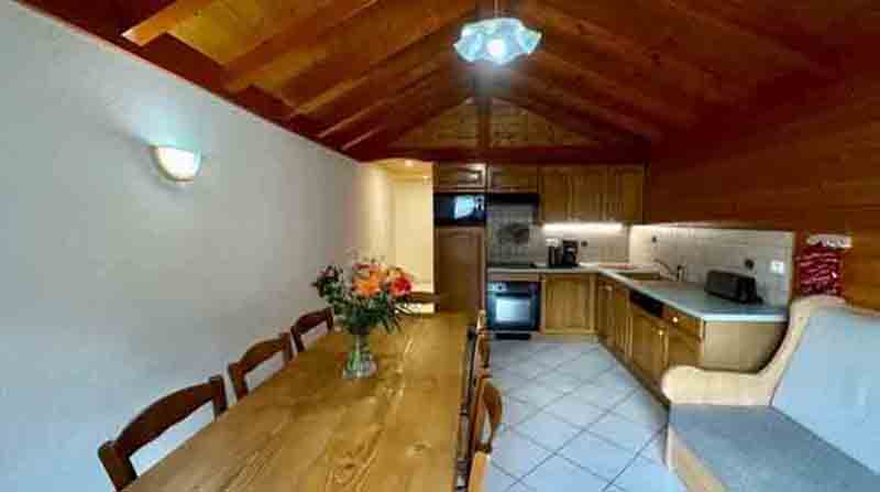 avec 1 salle à manger (canapé, TV écran plat et lecteur DVD intégré) avec coin cuisine équipée (grand frigo avec congélateur, four électrique, plaques vitrocéramiques, lave-vaisselle, avec ensemble vaisselle complet et nombreux accessoires : cafetière, bouilloire électriques, grille-pain…),